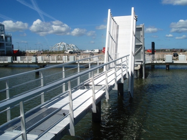 A unique example of the possibilities in aluminium is the Uiverbrug bridge at the Riekerhaven in Amsterdam. This bridge from 2003 is the world's first aluminium collapsible bridge that is also suitable for heavy truck transport. Due to the low weight of the material aluminium, this bridge - in contrast to most collapsible bridges - does not require a tail piece with a counterweight. A simple cylinder was sufficient here, so that a so-called bascule cellar was not necessary. In addition, both the energy consumption during operation and the total lifecycle costs of the bridge are low.